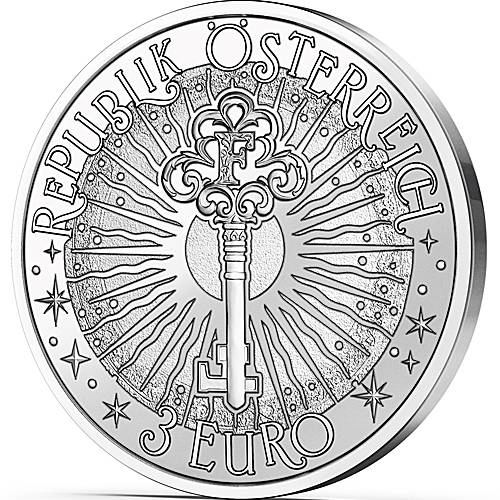Rückseite: Die Rückseite der Münze zeigt den Nennwert von 3 Euro. In der Mitte befindet sich ein Schlüssel und der Buchstabe F für Fabelwesen. Umgeben ist das ganze mit einem Sonnensymbol.