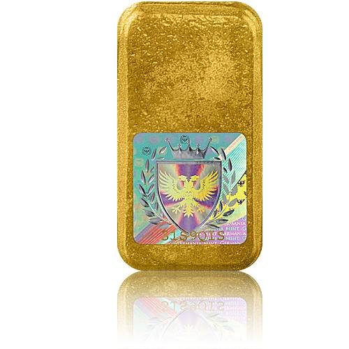 Der Goldbarren weist eine klassische Form auf und ist rechteckig mit abgerundeten Ecken und wird im Blister mit Seriennummer geliefert. Auf der Vorderseite des Barrens befinden sich verschiedene Prägungen und Gravuren, die charakteristisch für die Germania Mint sind. Das Zentrum der Vorderseite zeigt das Abbild der "Germania Mint".