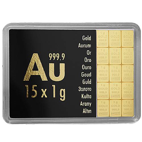Die Tafelbarren bestehen aus einem Verbung von 15 einzeln abtrennbaren 1 gramm Goldtäfelchen. Die Tafelbarren haben einen besseren Preis als einzelne 1 gramm Barren. Durch die Kapsel um die Tafelbarren und die günstigen Abmaße, lassen sie sich wunderbar in Tresoren stapeln.