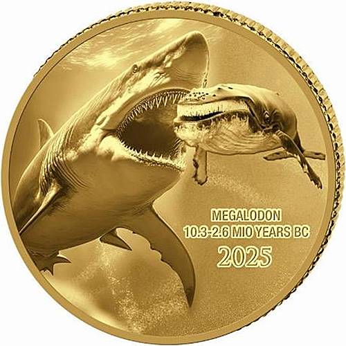 Die Goldmünze der neuen Serie Prehistoric Life, zeigt auf der Vorderseite einen Carnotaurus, im Hintergrund Felsformationen. Im äußeren Rings sieht man die wichtigsten Daten des Dinosaurus.