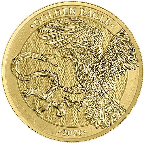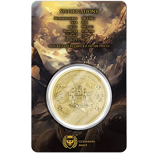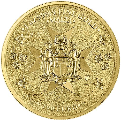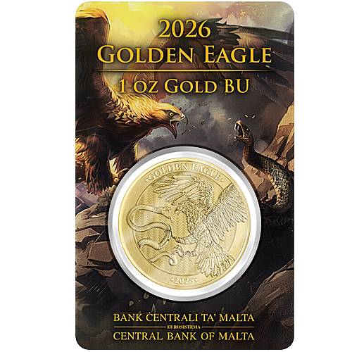 Verpackung: SafepackWunderschöne Variante der Germania Mint zu 1 Unze Feingold. Die Vorderseite zeigt den Golden Eagle - Steinadler kämpfend mit einer Schlange. Die beiden Tiere stehen sinnbildlich für das Gute und Böse. Die Rückseite zeigt das Wappen der Zentralbank von Malta auf einem Schild, das von einem Ritter gehalten wird.