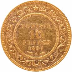 Die tunesische 10-Francs-Goldmünze von 1891 wurde während des französischen Protektorats unter der Herrschaft von Ali Bey geprägt. Sie besteht zu 90 % aus Gold.