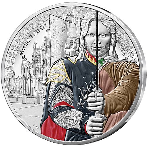Die Münze wurde zum 25. Jahrestag der Filmreihe von der Monnaie de Paris herausgegeben und würdigt die zeitlose Bedeutung von „Der Herr der Ringe“. Im Mittelpunkt stehen Aragorn, der rechtmäßige Erbe des Thrones von Gondor, sowie die majestätische weiße Stadt Minas Tirith, deren Türme als Symbol für Hoffnung, Widerstand und königliche Würde in Mittelerde gelten.