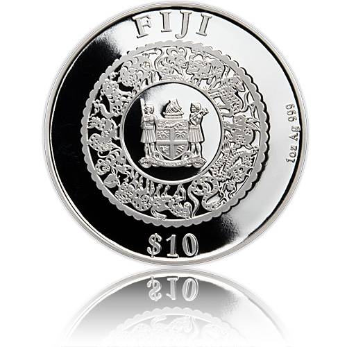 Auf der Rückseite der Münze sieht man das Nationalwappen der Fidschi-Inseln umgeben von allen Tieren des chinesischen Mondkalenders, darunter befindet sich der Nennwert 10 Dollar.