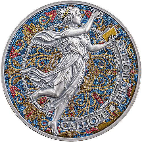 Die Silbermünze zeigt Calliope, die eine der neun Musen der griechischen Mythologie ist. Sie gilt als die Muse der epischen Dichtkunst und der Heldendichtung. Hier ist eine Beschreibung von Calliope sowie der Neun Musen insgesamt:
