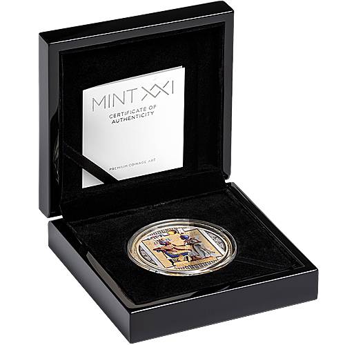 Diese ikonische Darstellung wurde von **MINT XXI** auf einer exklusiven 3-Unzen-Premiummünze aus reinstem 999er Feinsilber verewigt. In aufwendigem Hochrelief ausgeführt, offenbart das Motiv eine beeindruckende Tiefe und Detailgenauigkeit. Edle Vergoldungen, gezielte Poliereffekte und ein hochpräziser Digitaldruck lassen die historischen Farben des Originals lebendig werden. Ein bernsteinfarbener Einsatz rundet das Design ab und verleiht der Münze eine Aura authentischen Luxus. Jede Ausgabe ist durch eine **einzigartige Randnummerierung** individualisiert.