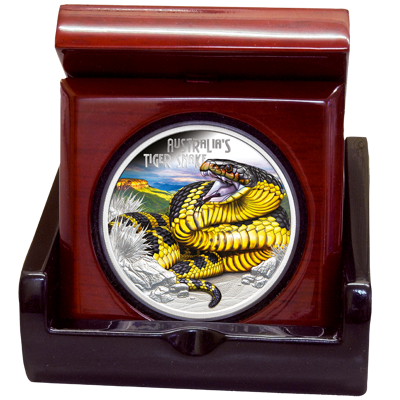 Das Motiv zeigt den Tiggerotter in seiner charakteristischen, dynamischen Pose, umgeben von einer filigranen Gestaltung, die die Gefährlichkeit und Anmut dieses faszinierenden Tieres widerspiegelt. Die Münze ist nicht nur ein ästhetisches Meisterwerk, sondern vermittelt auch eine besondere Wertschätzung für die Tierwelt.