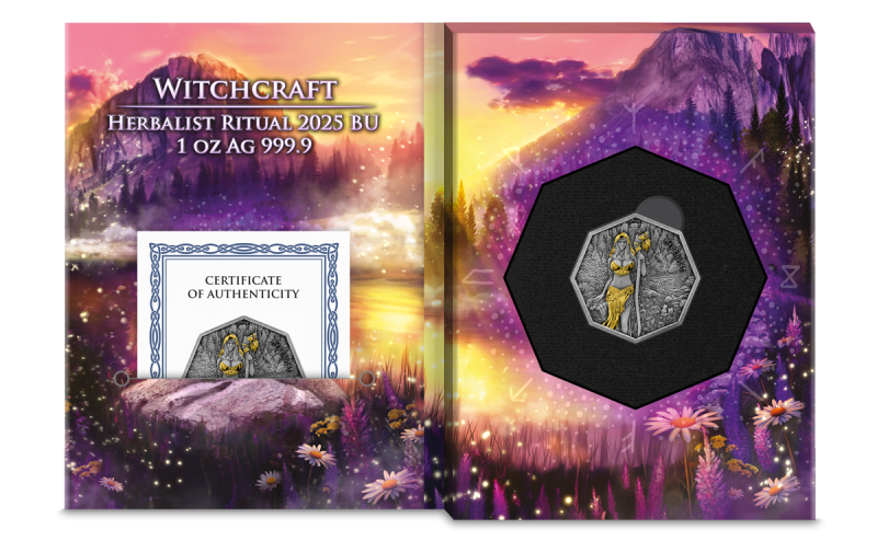 Die „Kräuterkundige“ ist die zweite Heldin der außergewöhnlichen Hexerei-Serie von Germania Mint. Die 1-Unzen-Silbermünze 2025 in Stempelglanz setzt die beliebte Kollektion fort, die herausragende Frauenfiguren der germanischen Mythologie ehrt – ausgestattet mit verborgenem Wissen und mystischen Kräften.