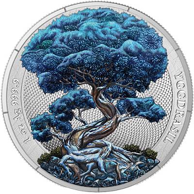 Die Vorderseite der Münze zeigt ein detailliertes Abbild Yggdrasil, der mythische Baum des Lebens im Winter. Das Motiv ist von hoher Qualität und weist feine Details und Reliefstruktur auf. Oberhalb des Baumes ,1 oz und die Feinheit "999.9 Silber zu sehen.