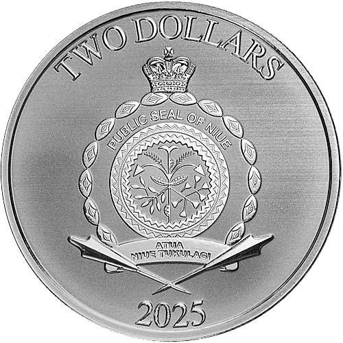 Auf der Vorderseite der Silbermünze befindet sich das typische Abbild von Mickey Mouse. Auf der Rückseite ist das Wappen Niue mit der Jahreszahl und dem Nennwert 2 Dollar.