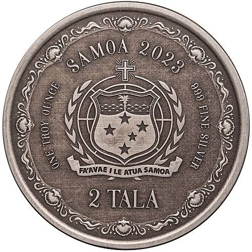 Auf der Rückseite der Münze befindet sich das Wappen von Fiji sowie der Nennwert und das Ausgabejahr. Das antike Finish verleiht der Münze einen altertümlichen Charme und betont gleichzeitig die Details des Designs.