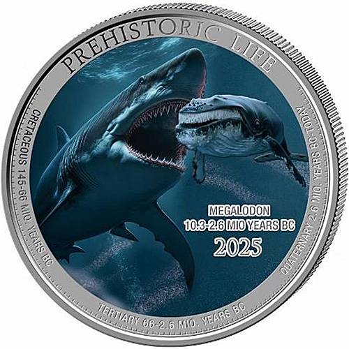 Die Silbermünze der neuen Serie Prehistoric Life, zeigt auf der Vorderseite den Carnotaurus farbig. Im äußeren Rings sieht man die wichtigsten Daten des Dinosaurus.