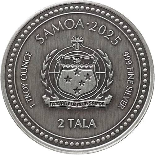 Die Rückseite der Münze zeigt das Wappen von Samoa, das aus einem stilisierten Schild besteht, auf dem ein Palmblatt und ein traditioneller samoanischer Kriegshelm abgebildet sind. Über dem Wappen steht der Name des Landes "Samoa", und darunter sind das Prägejahr "2023" und das Gewicht der Münze "1 oz" angegeben. Zusätzlich ist die Reinheit des Silbers, in der Regel "999" für 99,9% Feinsilber, aufgeprägt.