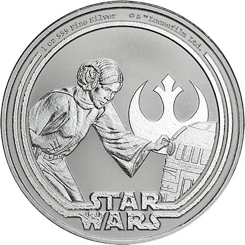 Auf der Vorderseite der Silbermünze befindet sich Prinzessin Leia. Auf der Rückseite ist das Wappen Niue mit der Jahreszahl und dem Nennwert 2 Dollar.