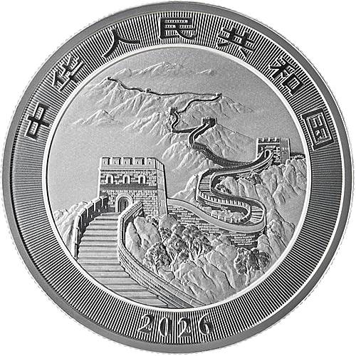 Die Rückseite zeigt die Chinesische Mauer, eingebettet in eine beeindruckende Gebirgslandschaft. Diese Darstellung steht sinnbildlich für die Geschichte, Beständigkeit und den Schutz des Reiches. Zusätzlich sind das Ausgabejahr 2026 sowie chinesische Schriftzeichen abgebildet.