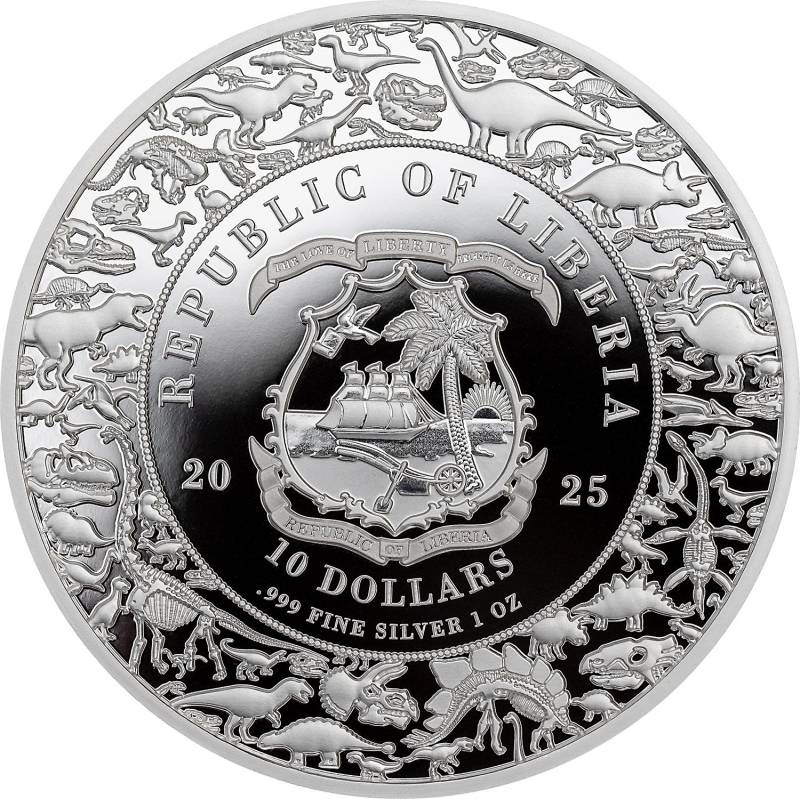 Die Vorderseite zeigt das Wappen der Republik Liberia, umgeben von verschiedenen Dinosaurier-Motiven. Das Wappen trägt die Inschriften „REPUBLIK LIBERIA“ (Ausgabeland), „2025“ (Ausgabejahr) und „10 DOLLARS“ (Nennwert).