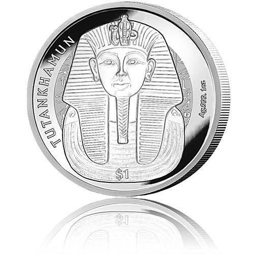 Die Silbermünze ist die erste Ausgabe die sich um den berühmten König Tutanchamun dreht. Zu sehen ist die berühmte Totenmaske König Tut, Ägyptens jüngsten und geheimnisvollsten Pharaos.