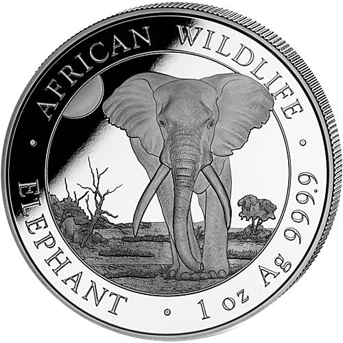 Vorderseite (Avers): Die Vorderseite der Münze zeigt das aktuelle Motiv eines Elefanten, das jährlich wechselt. Die Darstellung ist in höchster Prägequalität und zeigt einen majestätischen afrikanischen Elefanten in naturgetreuer Darstellung. Der Elefant wird von einer Vielzahl feiner Details umgeben, die sein Lebensraum und seine natürliche Umgebung widerspiegeln. In der Regel sind auf der Vorderseite auch Inschriften zu finden, wie der Name des Ausgabelandes "Somalia", das Ausgabejahr sowie die Angabe des Feingewichts, z.B. "1 Unze" und "999,9 Feinsilber", um die Reinheit des Silbers zu kennzeichnen.