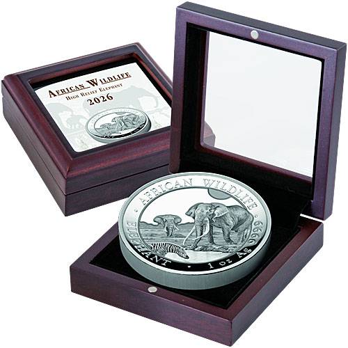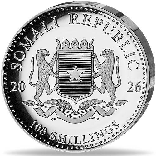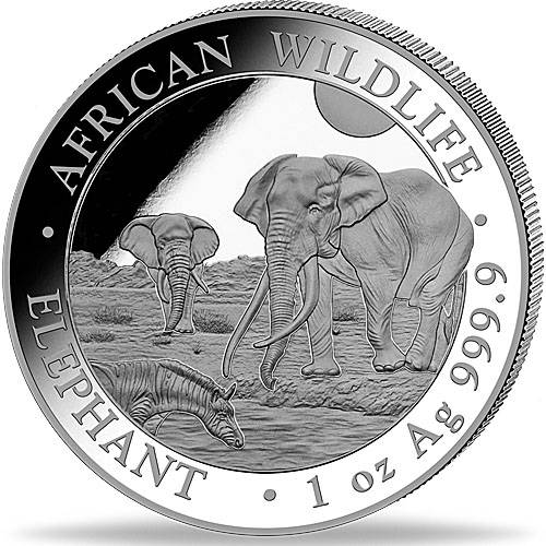 Auflage: 1.000 StückAuf der einen Seite ist der Somalia Elefant ( jährlich wechselndes Motiv) umrandet mit der Gewichtsangabe und Reinheit 999 zu sehen, auf der Rückseite befindet sich das Somalische Staatswappen und die Nennwertangabe.