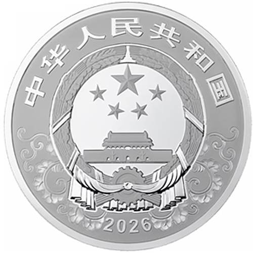 Vorderseite (Avers): Darstellung des Staatswappens der Volksrepublik China, eingerahmt von traditionellen Glücks- und Ornamentmotiven.