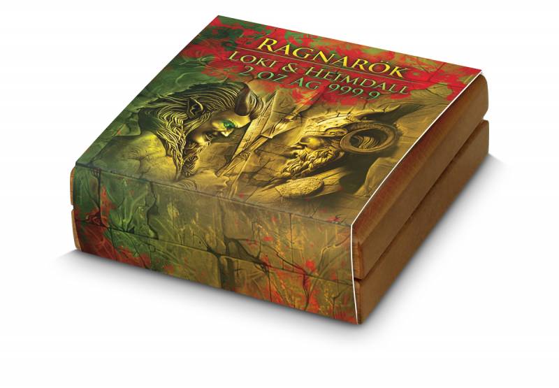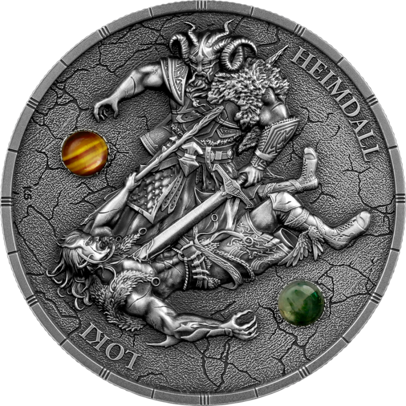 Die Rückseite zeigt die Artefakte beider Kontrahenten – Heimdalls Horn und Lokis Schiff – über einer aufbrechenden Welt am Rande der Zerstörung. Den Abschluss bildet der doppelköpfige Adler, das stolze Emblem der Germania Mint.