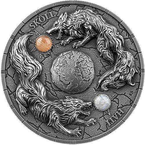 Wunderschöne neue Silbermünze der Germania Mint zu 2 Unzen Feinsilber. Die neue Serie Ragnarök setzt neue Maßstäbe mit einzigartigem UV-Effekt. Die Vorderseite zeigt die Germanische Bestien Sköll und Hati in einer sagenhaften Dicke von 4mm.