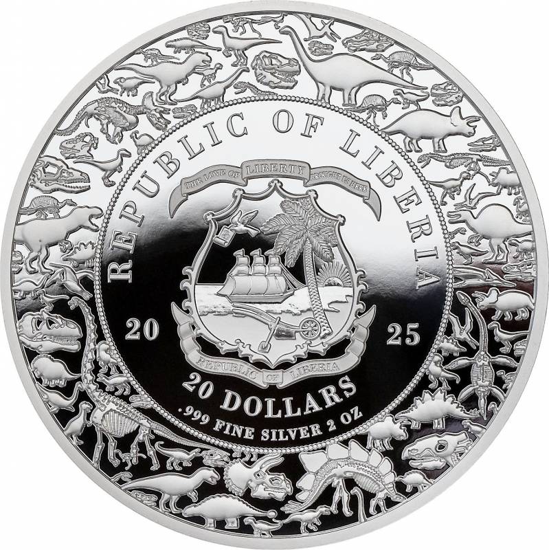 Die Vorderseite der Münze präsentiert das Wappen der Republik Liberia, umgeben von kunstvoll gestalteten Dinosaurier-Motiven. Ergänzt wird das Design durch die Inschriften „REPUBLIC OF LIBERIA“ (Ausgabeland), „2025“ (Ausgabejahr) und „20 DOLLARS“ (Nennwert).